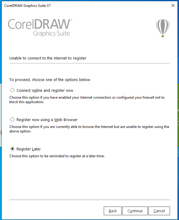 Nhấn biểu tượng CorelX7 ngoài màn hình desktop, 1 bảng thông báo hiện lên. Chọn register Later và nhấn Continue
